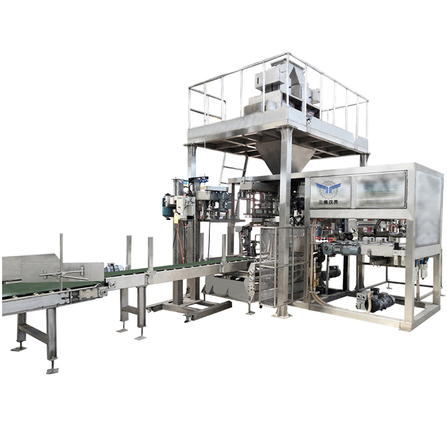 設(shè)備組成主要包括:包裝袋輸送機(jī)、上袋機(jī)、抽氣裝置、自動(dòng)折邊、縫包機(jī)、輸送機(jī)等。