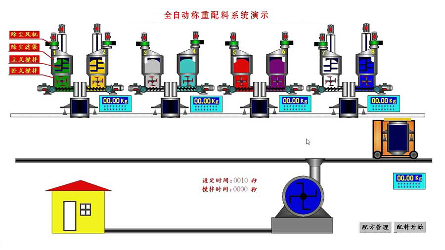 2. 自動(dòng)化配料系統(tǒng)自動(dòng)化程度高:采用IPC+PLC的對(duì)整個(gè)過程進(jìn)行集中管理,可同時(shí)運(yùn)行多種配方,系統(tǒng)根據(jù)設(shè)置自動(dòng)進(jìn)行配方的選擇與切換、料倉(cāng)的配置、二次投料的智能調(diào)整,實(shí)現(xiàn)了上料-配料-運(yùn)料-放料-攪拌-出料整個(gè)過程的無人化操作、自動(dòng)化生產(chǎn)和智能化運(yùn)行。